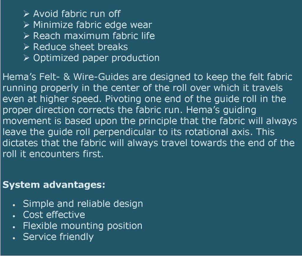 Paper Mill Auto Guide Auto Guide & Accessories Designed to keep felt or wire running centred Automatic guide system for paper machines, Made by Hema Paper Machinery in India- Systems are designed to keep felt or wire running cantered perfectly, - Improves paper quality, increases productivity, - Reduces waste. Hema also manufactures other paper-making machinery