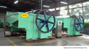 The drum of Decker Thickner is installed eccentric to the vat radius, with more clearance on the feed side than on the discharge side. The drum rotates in the direction of the incoming feed, carrying the pulp underneath the drum to a compaction zone on the other side where dewatering occurs. Filtrate passes through the perforated deck and is discharged through the open end of the drum and an outlet connection on the vat head. The liquid level inside the drum is lower than the level in the vat outside the drum, creating a static pressure differential that drives filtration. Pulp discharge consistency can be regulated by removing or adding stainless steel weirs to the overflow wall between the filter vat and the pulp discharge box. By regulating the same, Pulp is being made thicken for easy storage in chest.